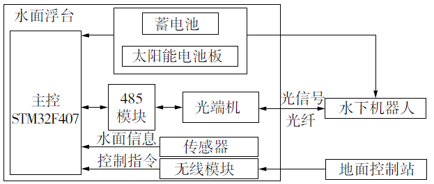 主控在定时器的作用下,间隔20ms读取一次深度数据以及姿态信息,并通过串口2 将采集到的传感器数据发送给光纤收发器的485接口,发送给水面浮台系统;同时通过串口1 从光纤收发器485接口接收上位机发送过来的控制指令信息;然后将接收到的控制指令解析出来,根据控制指令来控制推进器进行前进、转向、升潜等动作。视频信号经过摄像头采集后直接通过光纤收发器的模拟接口接到光纤收发器上,转换成光信号后通过光纤通信发送之水面浮台进行通信,不需要再编写特定的解码指令来传输视频信号,便于进行视频监控操作。