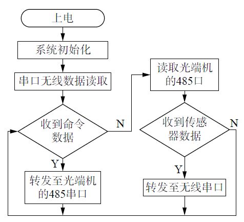' X2 r, H6 L/ @ 水面浮台主要完成整个系统供电任务以及中转通信任务,程序设计是在Keil 集成环境下使用C语言编写,编译、调试后下载至水面浮台主控板中,水面浮台软件工作流程如图7所示。