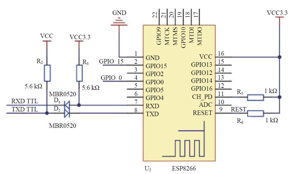 水面浮台与地面控制站之间的无线信号传输采用的模块为ESP8266,通过自带的TTL 串口与主控系统进行通信,控制信号与电源信号只需要与主控芯片进行简单的互联即可使用。如图6所示。