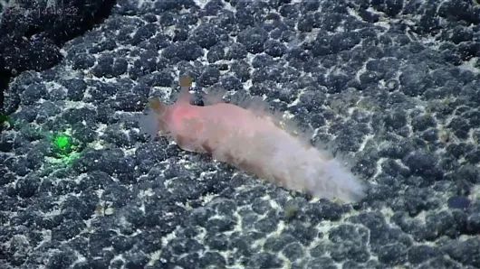 7 g$ T2 j$ d- U' v( l2 R; z1 i 海洋所三歧海牛(新种)体长达12厘米,前部呈粉红色,以红珊瑚为食,是首次在西太平洋发现的深海海蛞蝓(又称海兔),隶属腹足纲、裸鳃目、三歧海牛科。