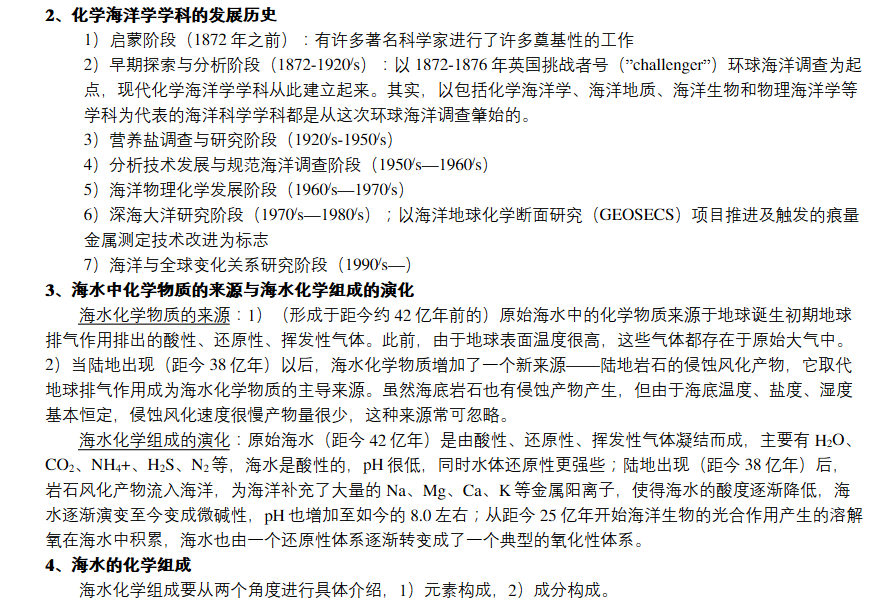 海洋化学是研究海洋各部分的化学组成、物质分布、化学性质和化学过程,以及海洋化学资源在开发利用中的化学问题的科学。海洋化学是海洋科学的一个分支,具有自己明确的研究目标,同时和海洋生物学、海洋地质学、海洋物理学等有密切的关系。它是海洋科学的四大基础学科之一。海洋化学研究海洋环境中化学物质的分布、转移、循环的规律及其在开发利用中的化学问题。 / I2 E( L( q. q% a& n