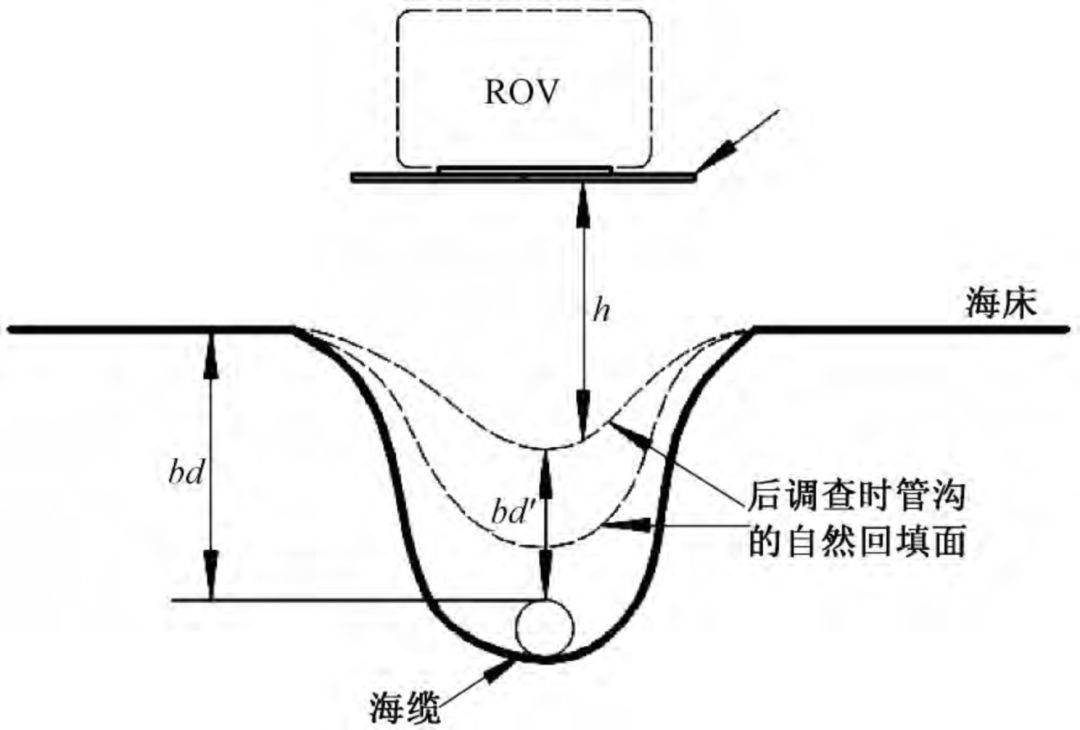 图中,bd为基准海床面距离海缆顶部的高度,即海缆的实际埋深;bd为TSS350/440探测得到的海缆埋设深度。显然,由于管沟回填不完全,将导致探测所得埋深bd小于实际埋深bd。 ' j3 x8 e- t8 \, Q% R" Y/ V. j