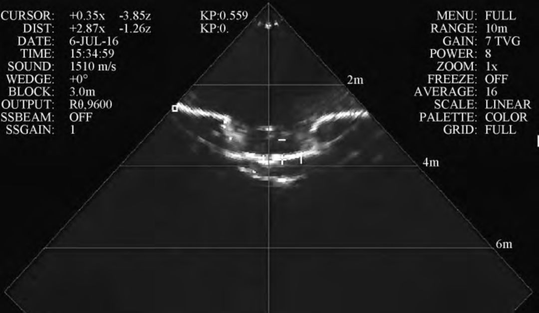 ( M2 M. R1 }( B% P; m o! z6 V m 在挖沟过程中,被吹扫起来的泥沙会对声呐产生遮蔽,尤其是存在诸如淤泥这类反射率较低的土壤以及海底流速很低的环境下,声呐基本无法扫描出沟型,除非停止挖沟,否则无法通过声呐判断出具体的沟深数据。 # l* n1 b5 I4 C( C' _8 p6 q- v