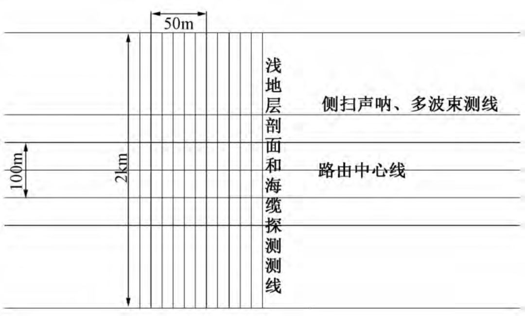 此种调查方法将预先以海缆铺设路由中心线为中央线,在路由方向两侧以50m 间隔布设多条横测线,进行单波束和侧扫声呐测量; 以路由中心线为中央线,垂直于中央线以50m 为间隔布设覆盖整个路由长度的多条长500m纵测线,进行浅地层剖面测量及海缆探测,测线布置如图3所示。
