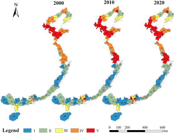 2000年、2010年和2020年格网尺度上因子图层的健康水平。V是生态系统活力,O是生态系统组织,R是生态系统恢复力,S是生态系统服务 2 B# ]# V# X& j9 m