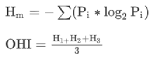 3 M9 j! K, Q! I( v( |) a 在公式中,Pi是样本中物种 i 的个体数与总数的比率;的样本,m代表不同物种的生物多样性指数,OHI代表海洋生态系统健康指数,H1, H2H3分别代表浮游植物、浮游动物和底栖生物的生物多样性指数 V4 V, ]1 z0 [1 K7 y, C