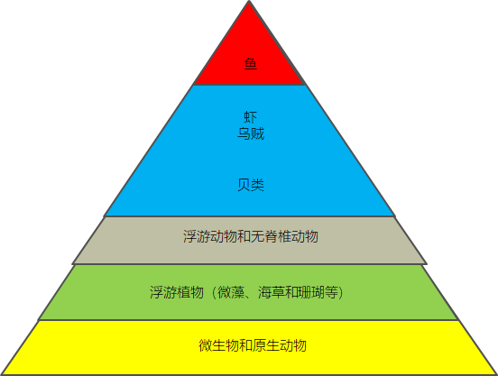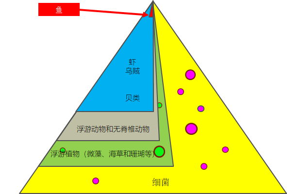 污染对海洋生态系统的影响 海洋中的食物链的顺序为:微生物和原生动物 -> 浮游植物(微藻、海草和珊瑚等) -> 浮游动物和无脊椎动物 -> 虾、乌贼和贝类等 -> 鱼。健康的状态应该是下图这样的一个金字塔。 图:健康的海洋食物链金字塔然而由于人类的活动的影响,现在海洋里的食物网金字塔是这样的:海洋中的细菌大量增加;往海里倒入大量的农药和工业毒物以及地震测试导致有毒海藻大爆发,占据主导;而由于沉积物、营养物和除草剂的增加,海草和珊瑚量减少,导致浮游动物变少,进而影响到虾、乌贼和贝类的数量。对处于最顶端的鱼来说,食物减少了。不仅如此,这些污染物还会导致鱼的繁殖成功率下降、早夭、栖息地减少,综合的结果就是鱼的种类和数量越来越少。 图:不健康的海洋食物链金字塔海洋中的微藻类、浮游植物和海草在海洋中依赖光合作用生存,是大自然的碳汇,地球之肺,制造了地球上 2/3 的氧气,也是海洋中食物链的基础。但是,自有记录起,由于过量的沉积物、富营养和农药的累积影响,2009年,全球海草消失 了30%,并且损失量以约每年 7% 的速度在增长。 ' e& O/ M$ ^2 u