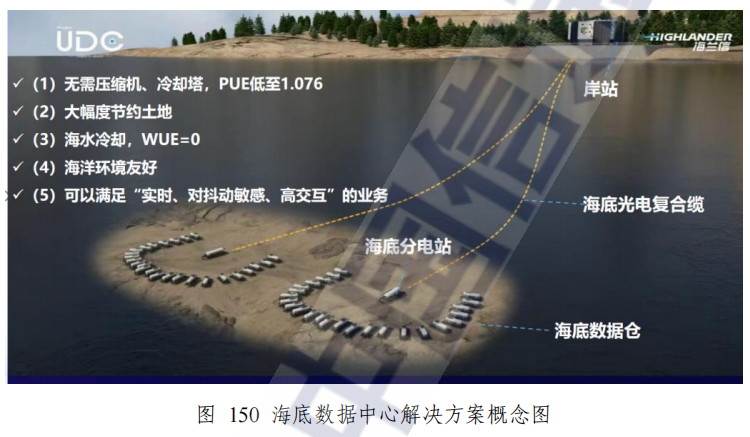 第三,与陆上 IDC 网络传输性能一致,根据中国信息通信院出具的与岸基的私有网络的检测报告,项目千兆端口带宽为939Mbps,抖动在 0.001ms-0.004ms 之间,单向平均时延在 1.002ms- 1,671ms 之间,平均丢包率在 0-0.0015%之间。基于以上结果,并根据 YD/T1171,在 UDC 环境下网络实测结果可满足类别 0 也就是“实时、对抖动敏感、高交互”业务的 QoS 要求。第四,极低 PUE 赛道内,综合成本比液冷低 30%,同时服务器也可以使用常规中高密服务器,冷却直接使用热管海水冷却交换,免除了全套液冷设备。第五,海底数据中心高度模块化,单舱部署灵活可靠,周期最短可达 3 个月。