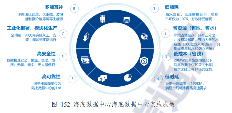 ; v6 N4 O, v+ z5 L7 [ 依靠海水自然冷源、无氧、无尘、模块化部署等条件,海底数据中心在能耗、土地、水资源、故障率、交付周期等方面较陆地数据中心有着独特的优势。根据清华大学传热与能源利用北京重点实验室出具的能效测试报告,海底数据中心的单舱 PUE 值为 1.076。这一指标保证了海底数据中心节能降耗,在其生命周期内具备比陆地数据中心更好的经济优势。由于海底数据中心散热不需要消耗水,运营过程中每年每个机柜可以节约 200 立方米的水资源。海底数据中心通过工程预制实现了快速部署,建设由“工地”迁移到“工厂”,具备了工业化的本质,可实现一体化交付,规模化运维。我国东部地区具有临海的区位优势,集聚了全国超过 45%的人口和近 60%的 GDP。对于上海、深圳这一类沿海超大城市,海底数据中心的价值特点尤为突出。