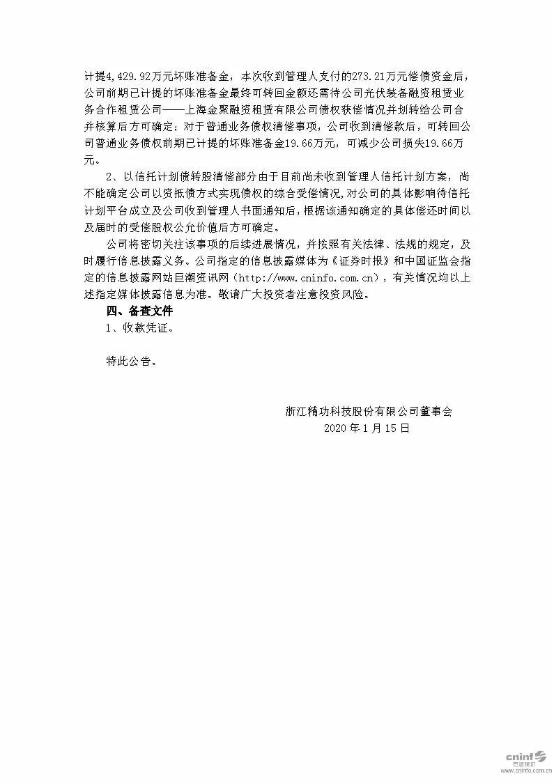 3 |# j8 Q7 M) J- q* F2 `, t 今日,精功科技发布“收到光伏装备融资租赁客户部分债权清偿款的公告 ”。 公告称:同意对公司申报的并经山东大海集团有限公司等五十七家公司管理人认定的2,632.06万元普通债权超过10万元的债权部分,按《山东大海集团有限公司等五十七家公司合并重整计划(草案)》 提出的普通债权清偿方案二的方式处理(现金清偿+未获现金清偿部分36%选择信 托计划)。即:债权本金中10万元以下(含10万元)的部分按照100%的清偿率一 次性现金清偿,清偿时间与普通债权主债权本金超过10万元的债权部分一致;普通债权本金中超过10万元的部分,按照普通债权主债权本金金额10%的比例在 2019年12月31日前以现金清偿;未获清偿部分按照36%的比例选择信托计划Ⅰ, 实质通过以资抵债方式实现债权的综合受偿,其余未获清偿部分的债权,债务人不再清偿。同时由公告可知,精功科技收到管理人债权现金清偿款 292.87 万元,其中:273.21 万元为光伏装备融资租赁项目普通债权清偿款,其余 19.66 万元为普通业务债权清偿款。 截至本公告披露日,根据《重整计划》的规定,公司申报并经管理人确认的 债权现金清偿部分已执行完毕,以信托计划债转股清偿部分尚未收到管理人信托 计划方案,尚不能确定公司以资抵债方式实现债权的综合受偿情况。 8 l; \; r: P, S# D