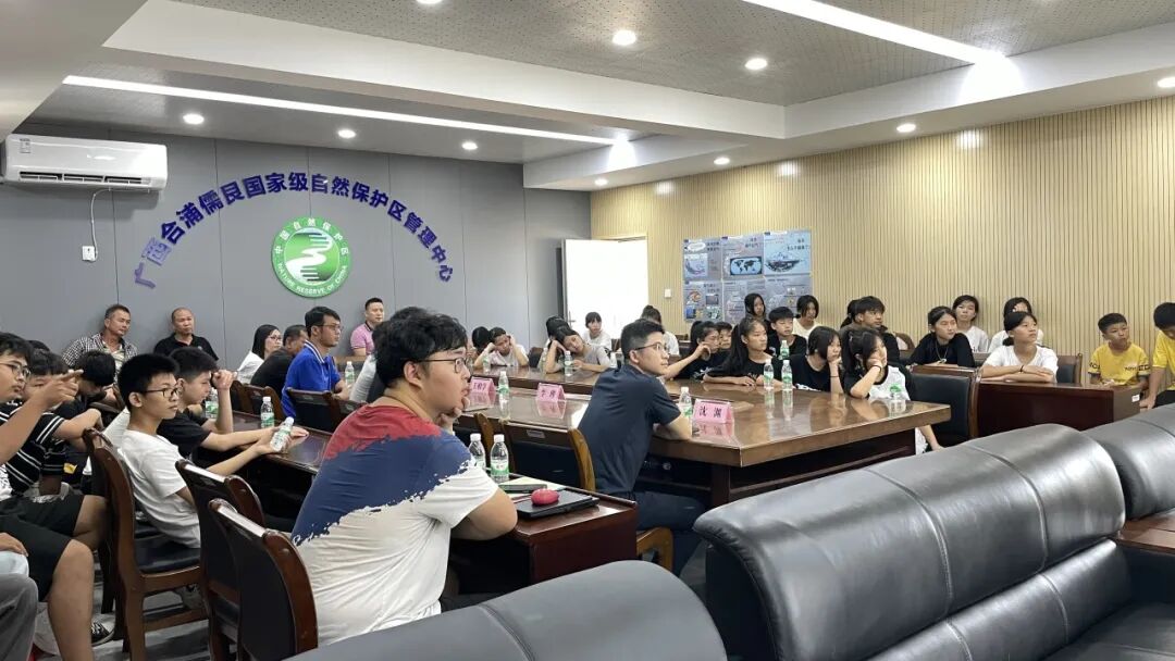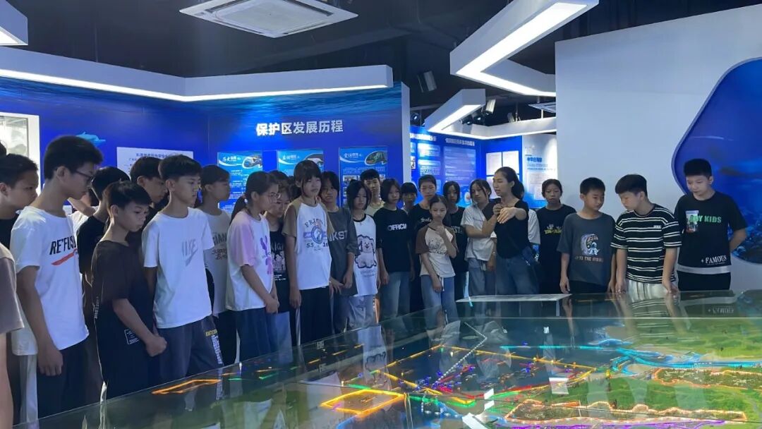 广西海洋生物多样性科普教育基地设有海草种质资源库、海草陆基繁育塘和蓝色海湾红树林造林区。儒艮保护区科技人员给学生们讲解了保护区的发展历程和保护区内海草床和红树林的保护和修复情况。通过参观科普教育基地,学生们学习了海草常识、海洋生态、保护区内珍稀海洋生物的生长环境、珍稀海洋生物的保护等方面的知识,观赏了保护区工作者视角下的海洋风光,感受到了科普的可观性。