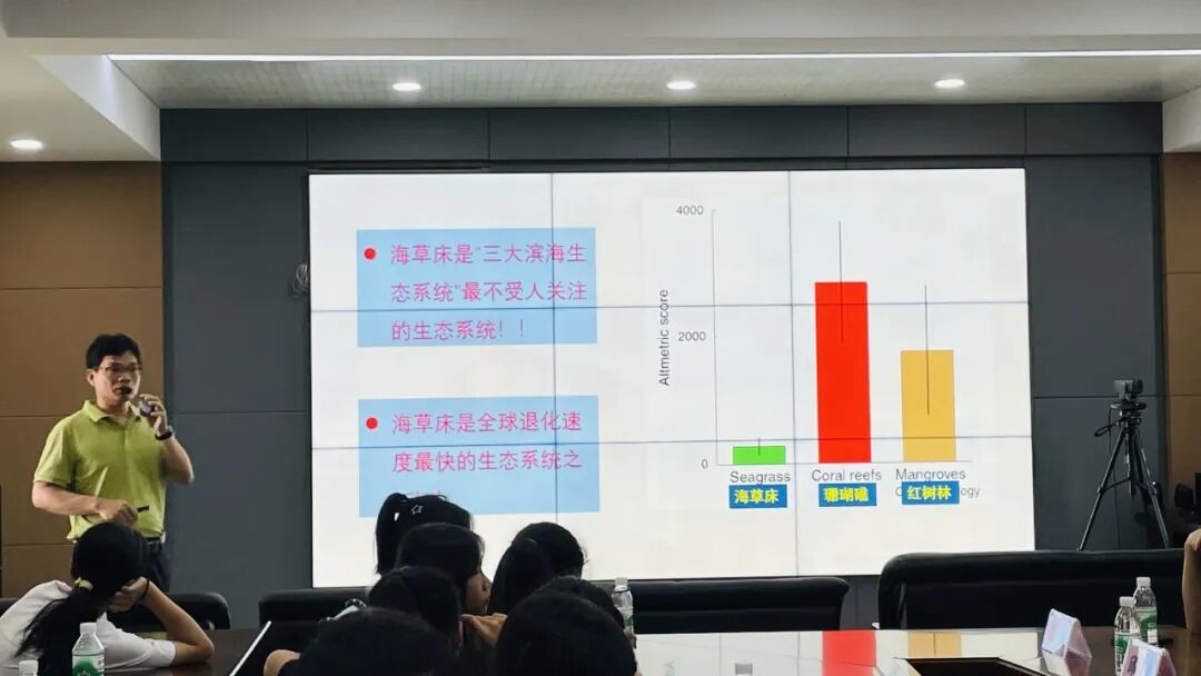 9 d5 o8 l3 c" L+ H: V# @( ?9 @' j 沈渊副教授主讲海草床的碳汇知识,为学生们解答海草的定义以及海草的生态功能,让学生们对海草有了更进一步的了解。沈渊副教授还用生动形象的语言为学生们解释了碳汇这个重要概念。碳汇即从大气中吸收二氧化碳等温室气体的过程,而相较于陆地生态系统参与碳循环形成的“绿碳”,“蓝碳”是指利用海洋生物吸收大气中的二氧化碳,并将其固定在海洋中的过程、活动和机制。海草床作为典型的蓝碳系统之一,有着巨大的碳汇潜力,它的固碳效率高、碳储量大、储碳周期长,在科学界得到越来越多的关注。 6 i, Z' H8 W8 Z8 R8 V