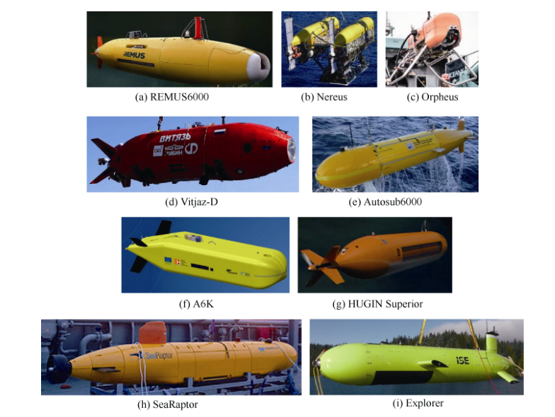 U; u- L2 \- R5 M% E 图1 国外大深度AUV/ARV ⑵俄罗斯。前苏联在深海潜水器结构材料研发及制造等方面取得了突出成果,苏联解体后,相关技术对俄罗斯发展大深度AUV起到了支撑作用。俄罗斯研制了MT–88、“大键琴”–2R–PM等6000m级AUV以及“勇士”–D(Vitjaz-D,图1(d))12000m级AUV。“勇士”–D系统由自主下潜器、海底站和指挥控制设备等组成。其中,海底站通过缆索与母船连接,作为水下基站与下潜器实现双向水声通信。2020年,“勇士”–D在马里亚纳海沟成功下潜至10028m,创造了无人深潜系统自主下潜的世界纪录。⑶英国。英国南安普顿海洋研究中心(NOC)研制了Autosub系列AUV。其中,Autosub6000(图1(e))最大工作水深6000m,采用双叶螺旋桨设计,曾多次在印度洋热液区、南北极冰下区等海域执行任务。该系列的最新型号为AutosubLR,通过融合水下滑翔机技术,其重量仅为Autosub6000的三分之一,能够实现6000km的长航程以及6000m的大潜深。实现该性能的关键包括单叶螺旋桨减阻技术与低功耗技术等。另外,AutosubLR比早期型号更加紧凑,是Autosub系列中首型不需要布放和回收设备的AUV。⑷法国。法国是AUV技术水平较高的国家之一,第一台用于海洋地球物理调查的AUV就诞生在法国。法国研制的Epaulard型和Nautile型AUV最大下潜深度均为6000m,完成了多次深海调查任务。ECA公司研制了A6K(图1(f))6000m级AUV,具有较强的续航及近底作业能力。⑸挪威。挪威Kongsberg公司研制了HUGIN系列AUV。其中,HUGIN6000和HUGINSuperior(图1(g))均具备6000m水深作业能力。HUGINSuperior是该系列的最新型号,采用可热插拔的62.5kWh锂聚合物电池,比同尺寸的HUGIN6000增加了30%的电池容量,使HUGINSuperior能够搭载额外的任务载荷,有助于提升其作业能力。另外,通过采用先进的定位技术,其导航性能优于其他同类AUV。⑹冰岛。冰岛Gavia公司研制的SeaRaptor(图1(h))AUV最大工作水深6000m,具有模块化载荷接口。因其母公司Teledyne在海洋传感器领域居领先地位,SeaRaptor集成了Teledyne旗下RESON、RdInstruments、BlueView等子公司的众多高性能传感器,也可按需定制其它传感器载荷。另外,SeaRaptor的传感器、电池、数据存储器等均可现场快速更换,有助于提升有效作业时间,高效开展深海调查、测绘、勘探、搜索等多种应用。⑺加拿大。加拿大ISE公司研制的Explorer(图1(i))AUV采用模块化设计,最大工作水深6000m,具有运维成本低、配置灵活和续航时间长等特点。该AUV曾在北极地区完成超过10D的连续冰下作业,实施了超过1000km的持续观测,充电和数据传输也可在冰下完成。⒉国内研究现状⑴中国科学院沈阳自动化研究所。20世纪90年代起,沈自所联合国内多家科研机构与俄罗斯共同研制了我国首台6000m级AUV——CR-01(图2(a)),随后在此技术基础上研制了CR-02(图2(b))。“十二五”、“十三五”期间,沈自所研制了潜龙系列AUV。其中,潜龙一号(图2(c))与其改进型潜龙四号(图2(d))均为6000m级AUV,已交付国家深海基地、大洋协会等应用单位。在ARV方面,沈自所研制了问海1号(图2(e))6000m级ARV,已交付中国地质调查局青岛海洋地质研究所,这是我国首台交付工程应用的ARV。沈自所还研制了海斗号(图2(f))和海斗一号(图2(g))全海深ARV,填补了我国万米作业型无人潜水器的空白。海斗一号自2020年起多次开展万米深潜与科考应用,最大下潜深度为10908m,刷新了我国潜水器下潜深度纪录,全球首次实现了挑战者深渊西部凹陷区大范围、全覆盖巡航探测。 图2 国内大深度AUV/ARV⑵哈尔滨工程大学。哈尔滨工程大学研制了悟空号(图2(h))全海深AUV,2021年实现10896m深潜,刷新了俄罗斯“勇士”–D创造的10028m的AUV潜深世界纪录。悟空号在万米深海中与母船直线距离超过15km,仍可准确传输状态信息至母船,上行峰值通信速率达2003bps,数据包接收正确率超过93%。⑶上海海洋大学。上海海洋大学研制了彩虹鱼号(图2(i))全海深ARV,2016-2017年在马里亚纳及新不列颠海域5000~11000m深度的多条海沟开展了海试。该项目计划建设“深渊科学技术流动实验室”,由1艘科考母船、1台全海深HOV、1台全海深UUV和3台全海深着陆器组成。⑷上海交通大学。上海交通大学研制了思源号(图2(j))全海深ARV,2021年完成了深海试验,最大下潜深度8072m,最长海底工作时间超过8h,完成了海底探测和取样等多种测试。⑸青岛海洋科学与技术试点国家实验室。海洋国家实验室海洋高端装备联合实验室(中船重工集团部分)研制了问海号(图2(k))全海深AUV,2021年完成了万米级海试及试验性应用,最大下潜深度10218m,最高航速5kn,最长续航里程40nmile(2kn航速条件),是目前国内航速最快、续航里程最长的全海深无人自主潜航器。- Q6 c1 i; x$ J; s/ q