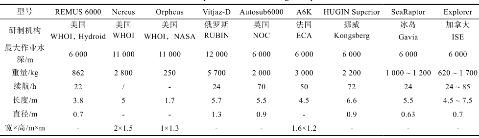 表2 国内大深度AUV/ARV主要技术指标 ( B# e. X1 H. l1 j