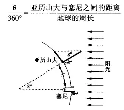 3 ?2 p, w' ]6 a% B 上图为《圆的历史》图5.2,展示了埃拉托色尼测量地球周长的原理。