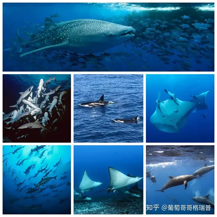 科科斯岛是世界上最好的”大货“潜水目的地之一。除了最著名的是锤头鲨,您也可以找到许多其他鲨鱼和鳐鱼,包括白鳍礁鲨、丝鲨、加拉帕戈斯鲨、虎鲨、鲸鲨、蝠鲼、大理石鳐、鹰鳐。这里有常驻的海豚群,而逆戟鲸和座头鲸也偶尔在此出现。 8 |$ z, @6 ~7 G! t