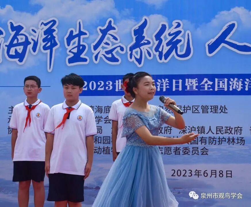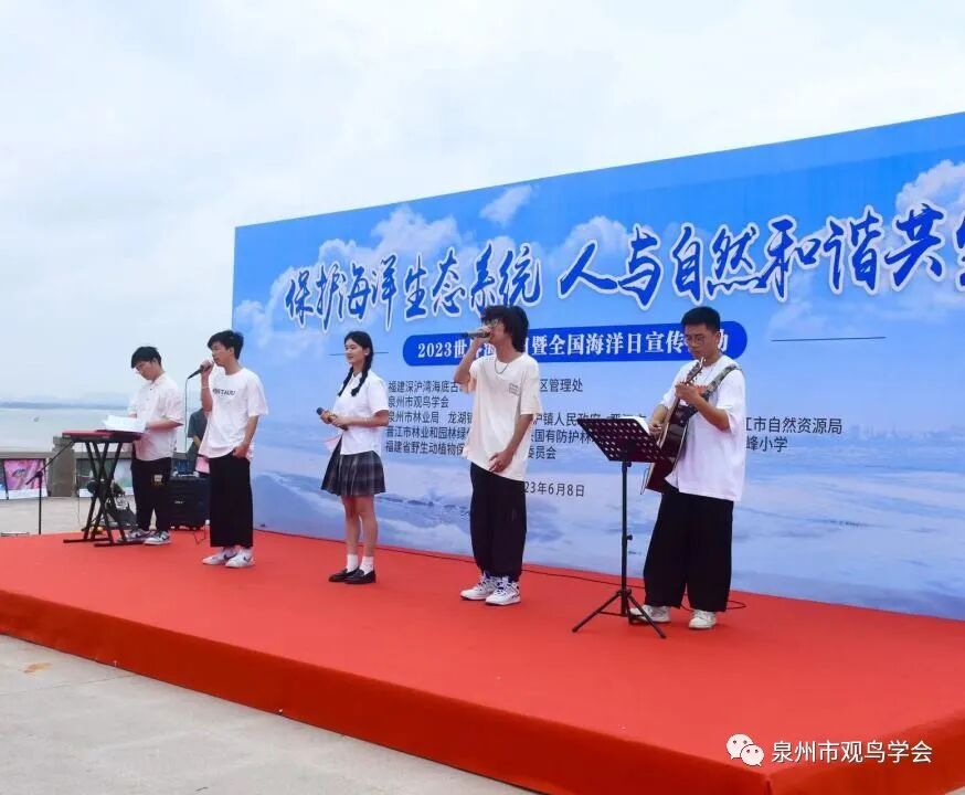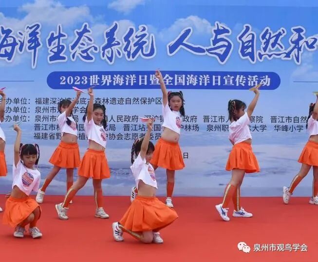 ! J/ B. p8 B* @: @9 } 由华峰小学同学们带来的舞蹈表演《孩子的天空》、朗诵表演《中国脊梁》,以及泉州职业技术大学学生带来的乐队表演《最初的梦想》,无不展现了当代青少年蓬勃的朝气与良好的精神风貌,也传达了青少年们保护海洋环境的决心与信念。