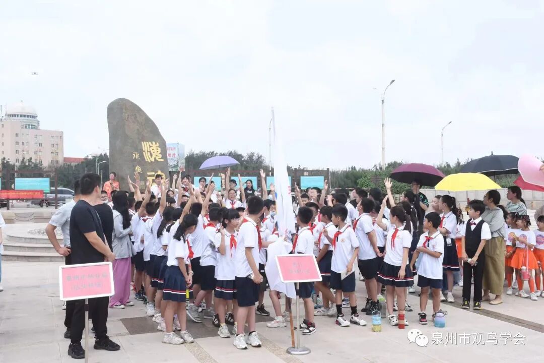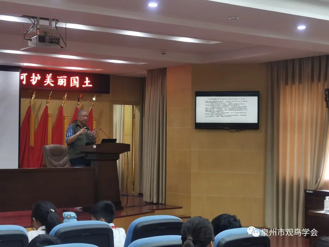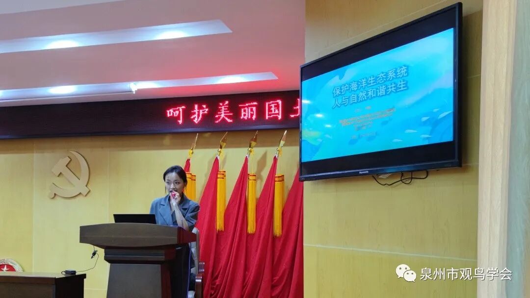 仪式后,泉州市观鸟学会科普老师陈庆煌和李燕为来自华峰小学的同学们开展《保护海洋生态系统,人与自然和谐共生》海洋日科普课堂,向同学们科普海洋知识、介绍围头湾鸟类等野生动植物,解读海洋政策,普及野生动植物保护相关法律法规。