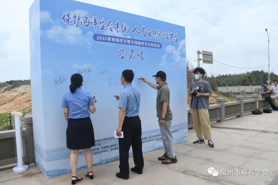 活动现场,福建深沪湾海底古森林遗迹自然保护区管理处副主任吴艺敏、晋江市林业和园林绿化局副局长黄志向、晋江市自然资源局二级主任科员何团祖、深沪镇人民政府副镇长张晨亮等领导嘉宾在“保护海洋生态系统,人与自然和谐共生”主题背景签名墙上郑重地签下了姓名。
