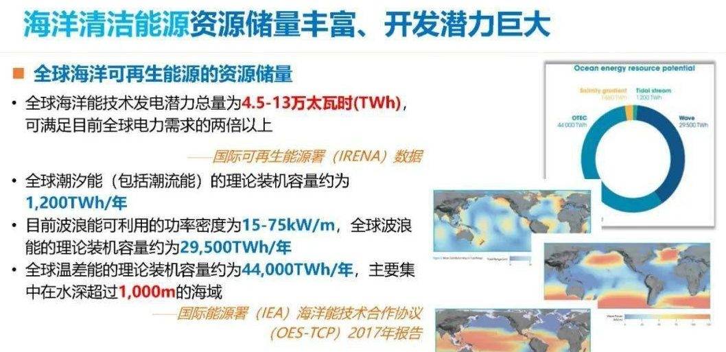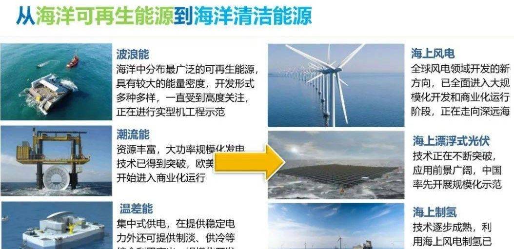 2 t% Z! e- s# k* T: k 海洋清洁能源资源储量丰富,开发潜力巨大。波浪能、潮流能、温差能等海洋可再生能源拥有巨大的开发潜力,商业化前景广阔。与此同时,海上光伏是一种全新的海洋能源利用和资源开发方式,是光伏发电的未来发展方向。海上风电机组的发展趋势是向着超大规模发展,国内大型机组研发技术已经实现了突破,运维模式正朝着数字化、智能化和精准化的方向发展。 6 B& l" E+ y( C5 n- a+ o