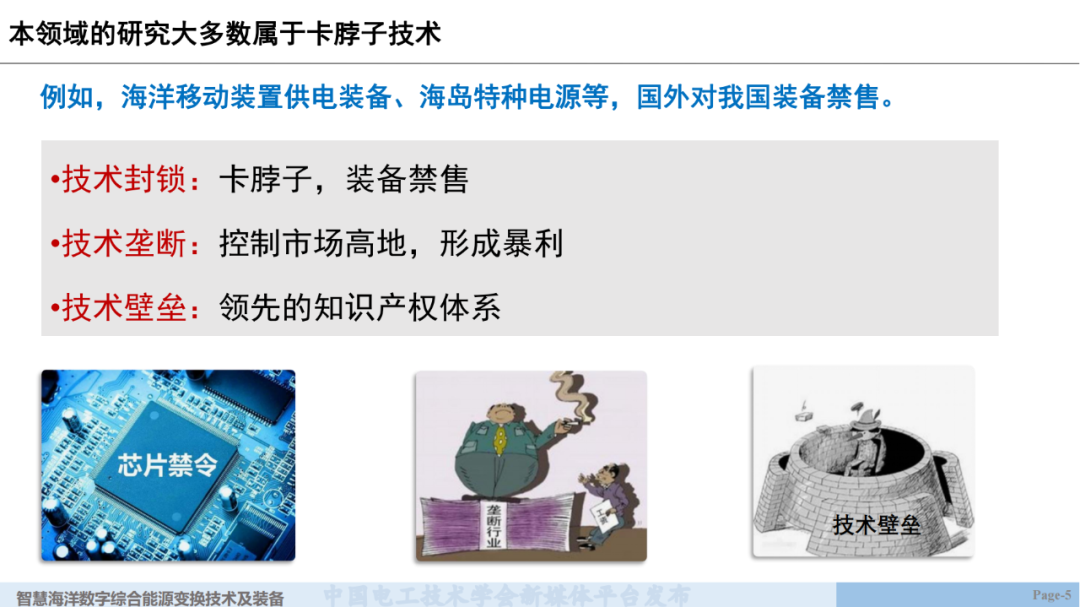 7 _" X6 L1 V f, }8 k/ Y 智慧海洋综合能源电力与信息网供电保障系统三大痛点:1)系统所需高端芯片、传感器等核心元部件被国外技术封锁;探索研究环境恶劣,工作艰辛、费时费力,投入大、风险高;3)理论体系和技术标准尚不完善。