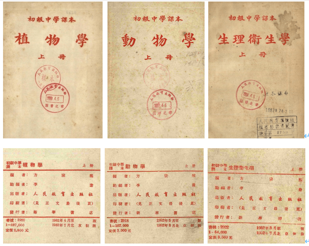 - g! V; v! N- R: Q 方宗熙编写的初高中生物课本 方宗熙还主持编写了高级小学课本 《自然》(上下册,编者方宗熙、陈同新、江乃萼、周芬、许南明、任树德,人教社1953年3月原版)。本书参照苏联小学自然课本编写而成,适用于小学五六年级。1954年该书改为四册,并加上彩色插图。方宗熙编写的上述教科书,均入选教育部和出版总署发布的春秋两季中小学教科用书表中,并成为 新中国第一套生物通用教科书和小学自然统编教材。" Y6 }* M, c: J