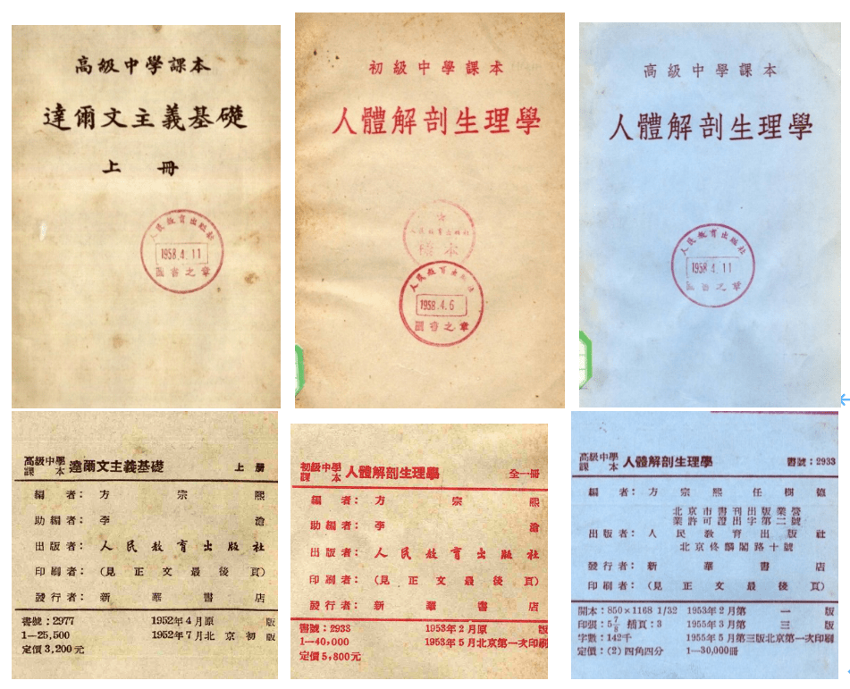 / @# G5 Y+ J, ~/ v9 u' o' F 二、在人教社工作的方宗熙 关于方宗熙来人教社,叶圣陶1951年5月3日的日记里有一段记载:“方宗熙君校订世英之自然地理,指出错误数处,为之重写,皆甚切要。……以往通过书稿太随便,今后宜取严格。然如何得人审阅,实为最难解决。方君毕业于英国,得博士,系愈之避地南洋时之友人;近来总署,以后将请其转入教育社,主持生物一组。我社向无生物组,今从自然组分出,所余者改名数理化组。”可见 方宗熙的“出场亮相”很不一般,让叶圣陶另眼看待、印象深刻,并决定调其到人教社工作。1951年5月15日,人教社生物组成立,组长方宗熙,组员李沧、濮源澄。1952年7月,生物组扩充为生物编辑室,人员有所增加 (任树德、江乃萼)。与方宗熙同时在人教社做编辑组长或室主任的,都是年龄比他大、资历比他深、从业时间比他长的名家学者,并且生物组(室)的工作人员也是最少的。但是,作为教材编写新秀的方宗熙,所做的工作一点也不少,其“出场亮相”不一般,“出手招数”也很不凡,仅仅两年时间,成果相当可观——主编中小学生物和自然教科书6种19册,发表有关生物教材论文6篇,还出版3部著作 (含合译2部)等。方宗熙到任后第一项工作是“校订”林英、文彬如编的《初级中学生理卫生课本》(人教社1951年8月版)。接着,他便投入所有生物教科书的自编工作,即初中课本《植物学》《动物学》《生理卫生学》和高中课本《达尔文主义基础》。这些课本均为上下册,1952年春季由人教社出版,助编者李沧、濮源澄。这套教科书大都以东北人民政府教育部编译苏联的各种生物教材为蓝本改编而成,依据的是教育部1951年《中学生物科课程标准草案》。 方宗熙编写的初中生物课本 方宗熙又根据教育部1952年编订的《中学生物教学大纲(草案)》,结合材料和我国实际,对上述初高中生物教科书进行了全面修订,并都合并为全一册,均于1953年春季由人教社出版。其中,初中课本《生理卫生学》改称为《人体解剖生理学》,又与任树德合编了高中课本 《人体解剖生理学》。