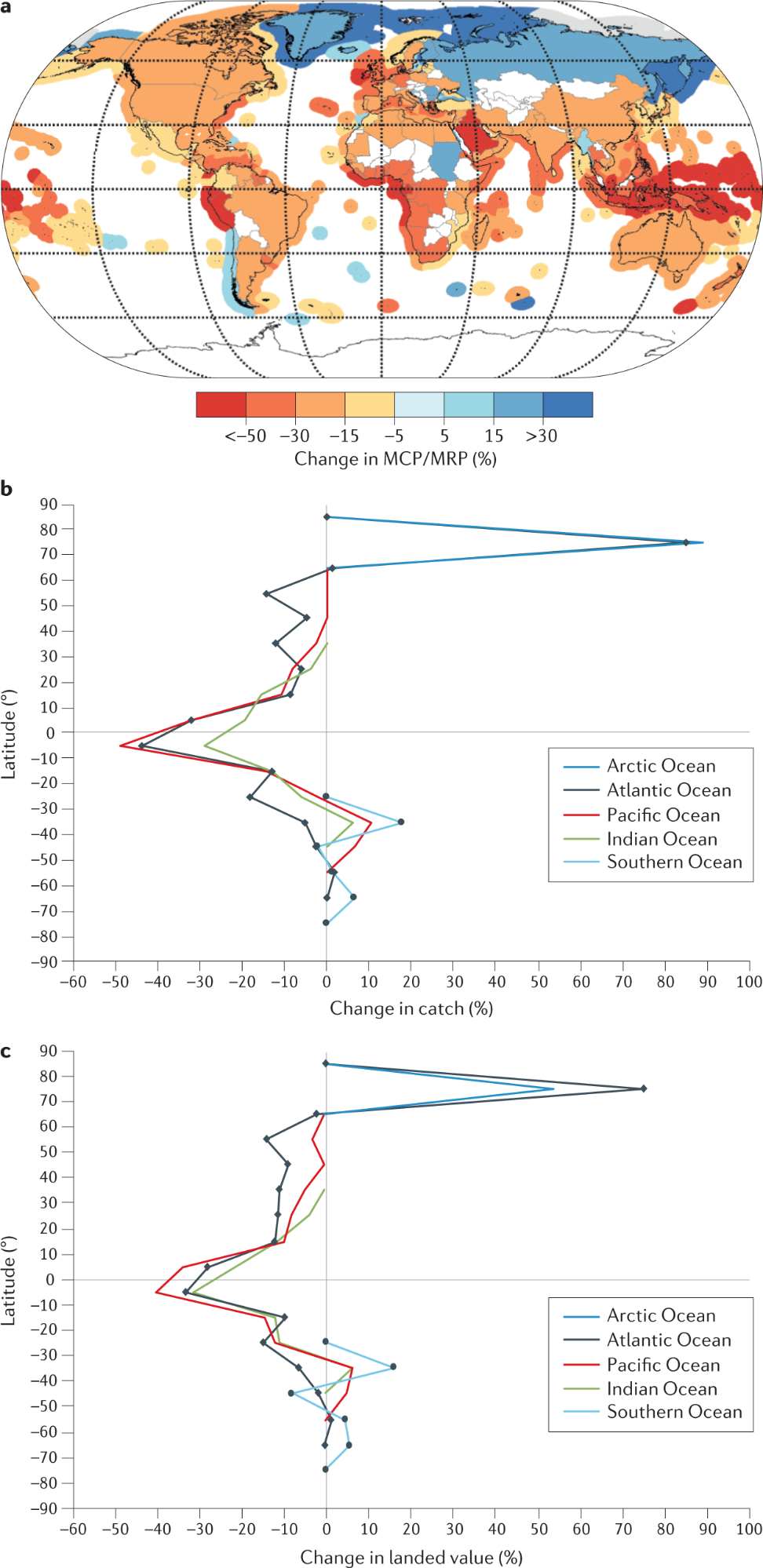 图3. 气候变化对海洋鱼类捕捞潜力和渔业经济的影响[2] 1 g( t2 K6 O: b8 {) O3 U L. J