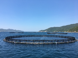 图1. 海水鱼类养殖:(a)普通网箱养殖;(b)深海网箱养殖;作者拍摄。 $ e @: z) B' F4 L+ \