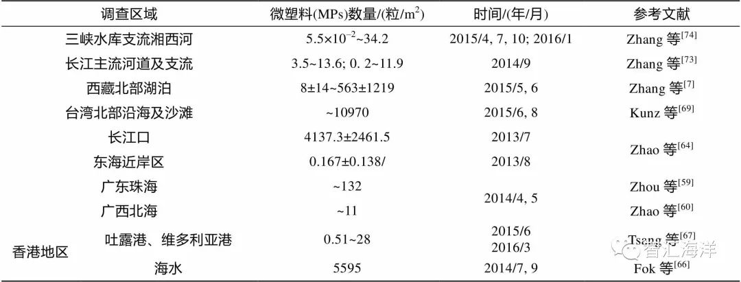 5 l" ?0 s) }9 N7 r. X. p( a/ \ 表1 我国沿海与陆地微塑料的数量与分布