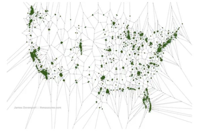 图1:展示每个星巴克位置的Voronoi图(图片来源:JAMES DAVENPORT)
