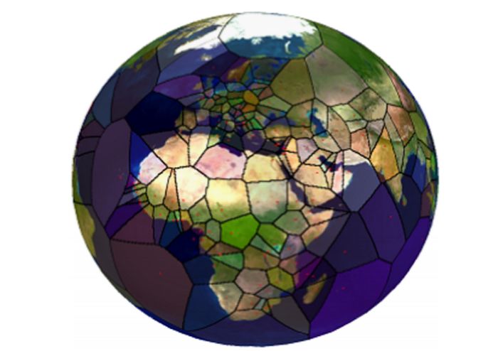 [4] For more on tessellations using voroni methods on Earth’s surface, see:Hu, H., Liu, X. & Hu, P. (2014) Voronoi diagram generation on the ellipsoidal earth. Computers & Geosciences. [Online] 73, 81–87. Available from: doi:10.1016/j.cageo.2014.08.011.