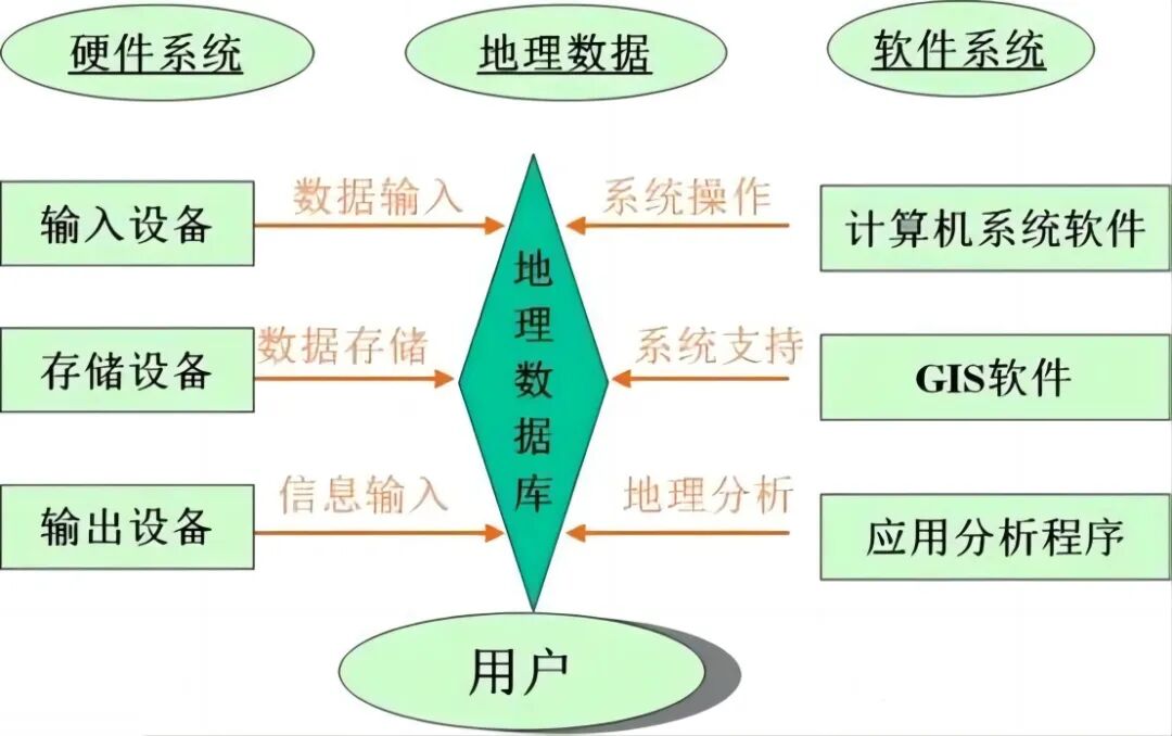1.计算机硬件系统;2.计算机软件系统;3.地理空间数据库;4系统管理操作人员; - |& f8 M# w7 `! n, x8 Y
