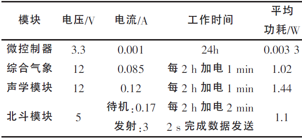 基于北斗通信的海洋多要素观测系统的总体功耗在3.6W左右,搭载太阳能电池板补充供电,能够满足无人值守的情况下正常运行2a以上,符合设计要求。