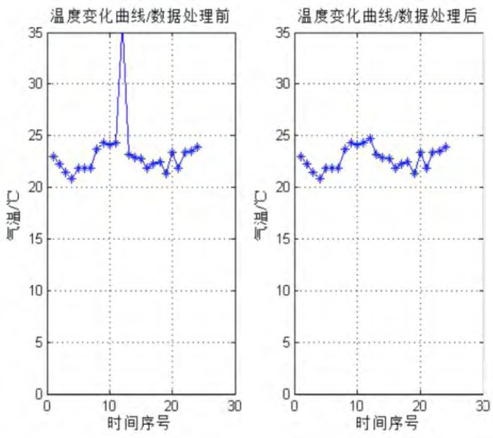 - V- S7 V( P) G 从数据的采集情况可以看出,系统基本按照2h采集传输一次数据,能够正常运行。此次测试共获得48h 累计24组数据。数据处理中发现有异常数据出现,如图5所示,温度值在某时刻突然高于当前平均温度。对于某一区域来说气温和气压在很小时间内的数据可以看做不变的,由于实验环境及设备本身可能会引入一些比较大的误差,因此就需要剔除异常程度大的数据,然后根据前、后数据做内插处理。 - s* w5 R J" `& u9 i; |& P: b C
