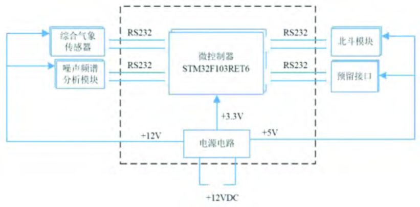 3 j0 k9 u& J, @6 T 首先在实验室进行系统测试。测试时,将浮标和比测用水听器固定于水池中同一位置处,比测用水听器采用含前置放大器的水听器,用于环境噪声比测,比测水听器的采集系统选用进口的NI PXI-1031数据采集系统。系统供电由12V直流电压源提供,系统连接如图3所示,将综合气象传感器连接到微控制器串口1,声学模块连接到微控制器串口2,北斗模块连接到微控制器串口3。 . m* U( f6 }, J4 {! q4 i7 p