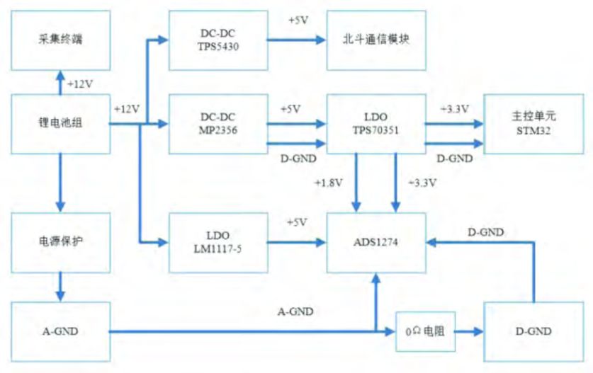 由于数据采集系统各部分所需电压不尽相同,因此需设计电压转换电路对12V电压源进行分配,以保证系统的正常供电,电源管理设计如图2所示。高容量锂电池组提供的12V电压的一部分直接接入采集终端(气象、水文传感器、噪声频谱分析模块等)供电;另一部分通过高效率DC-DC电压转换器MP2359和线性稳压器LM1117-5将12V电压源分别转换为5 V电压源,同时分别接入模拟地和数字地,模拟5V电压源提供给模数转换芯片ADS1274,数字5V电压源通过线性稳压器TPS70351转换成主控芯片STM32与模数转换芯片ADS1274工作所需的数字3.3V与1.8V电压。电源电路的供电保护通过在电源接入端口设置二极管来实现。另外需在模数转换芯片附近用一个0Ω的电阻连接数字地与模拟地,使整个电路有一个公共的参考零电位,以降低外部噪声对电路的干扰。 , |5 v7 |' K. }8 U- y# h- G! @