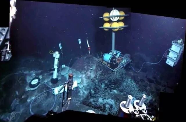 图7显示了一个海底原位观测站在海底热液地区工作的情景。这个原位观测站是用来观测热液烟囱的温度变化的,由浙江大学设计制作2 |& L7 o: O4 }