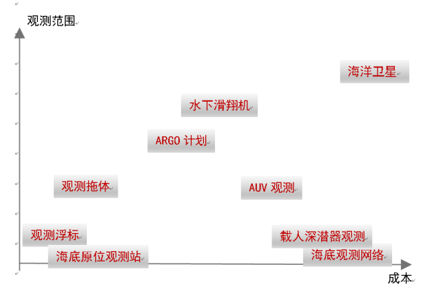 7 A0 X; a$ J- J$ E$ i 不同的观测手段,观测涉及范围也是相去甚远。譬如海洋卫星的观测范围很大,甚至可覆盖一个海区。而一个海底原位观测站,其观测范围只有传感器能及的很小范围。图5显示了不同观测技术的观测范围与成本的比较。当然,从观测精度来讲,海底原位观测站的观测精度,一般来讲要比海卫星要高许多。 # q5 }* X3 @+ R# P' n