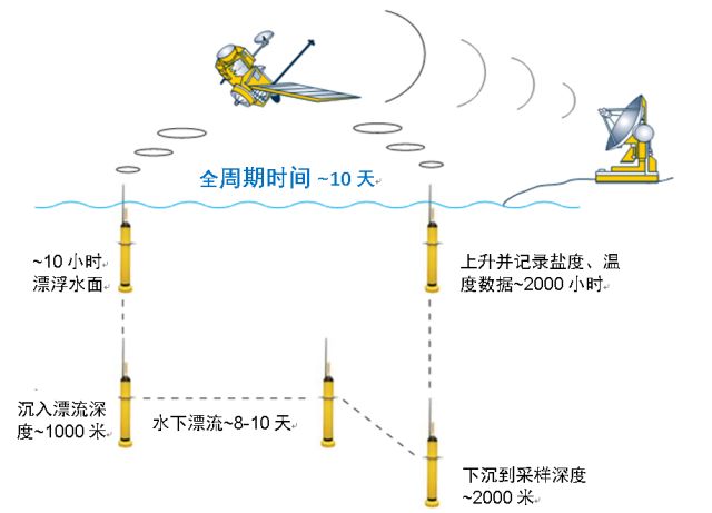 3 k9 T0 [4 T8 g! U6 P 图6显示了海洋漂流浮标的工作流程。很多人都知道,世界各国共同实施了ARGO计划,在世界各大洋中布放了大量的漂流浮标,来开展对海洋的动力参数甚至生化参数的大范围观测。截止2017年3月,世界各大洋中正在工作的漂流浮标共有3936个。其中美国贡献量最大,布放了2210个浮标。英法德日澳等国积极参与了这项计划,我国也积极参与并布放了117个浮标,并在国家海洋局第二海洋研究所(杭州)设立了ARGO数据处理中心。从图6表示的漂流浮标工作流程中,我们可以看到,我们通常是8-10天之后通过卫星获得一批数据,随着浮标的漂流,我们可以获得一个海洋切面上的海洋动力参数,如确定深度下的温度、盐度甚至流速等等。这些数据,很好地支撑了海洋科学研究,海洋大气预报等工作。 2 h }8 k4 P! O6 _9 K