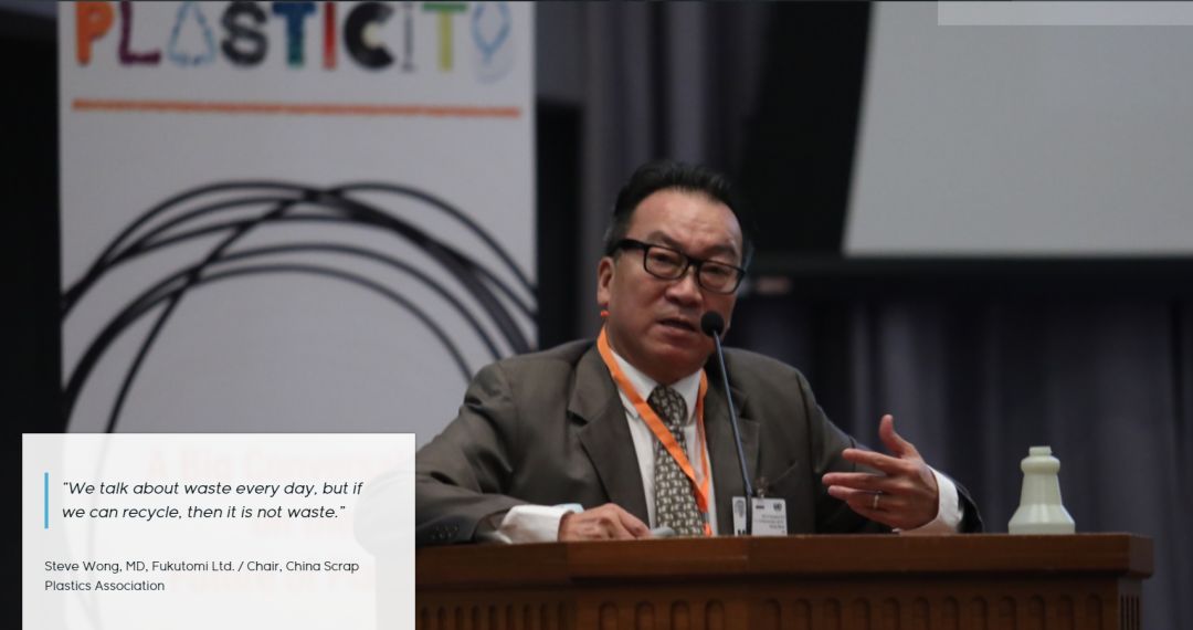 6 q7 \" E5 a, q: F \8 J 中国废塑料协会执行会长黄楚祺在第二天“通过创新和商业的解决方案”发表主题演讲。