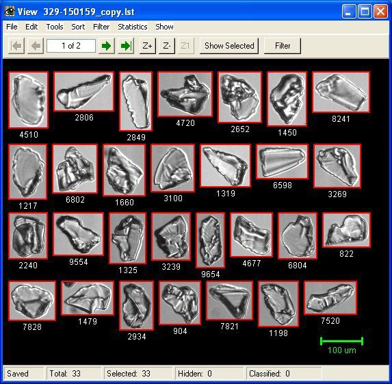 智能化的VisualSpreadsheet 分析软件;自动化计数和分类,有专利权的散点图特性,即刻显示框中区域内的所有颗粒物图像和特征数据,对其进行分析 4 y; C% G$ [; Y) T$ S3 m4 i