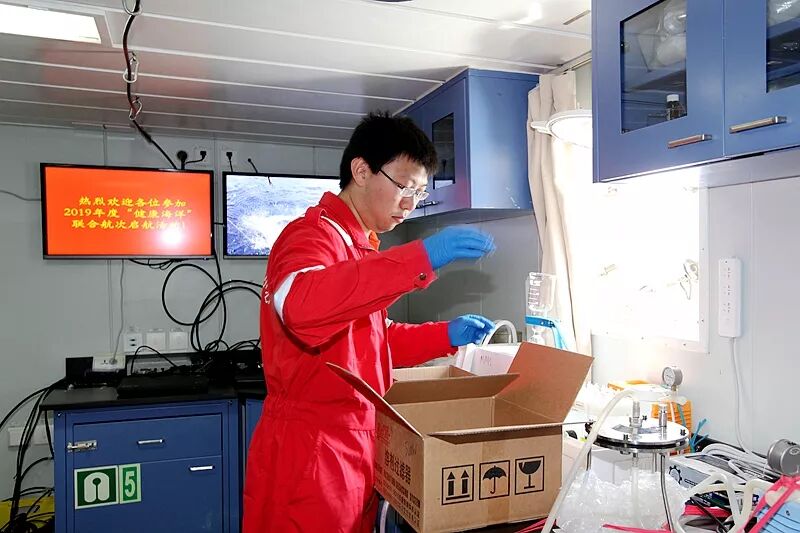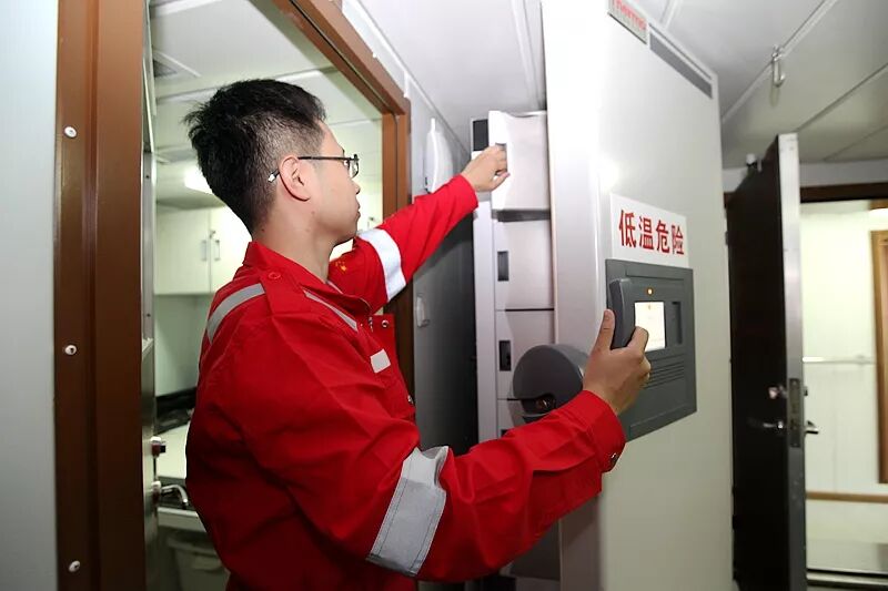 ! ]5 V4 Q: J6 u3 q. P& U& V 科考人员出航前检查超低温冰箱运行情况