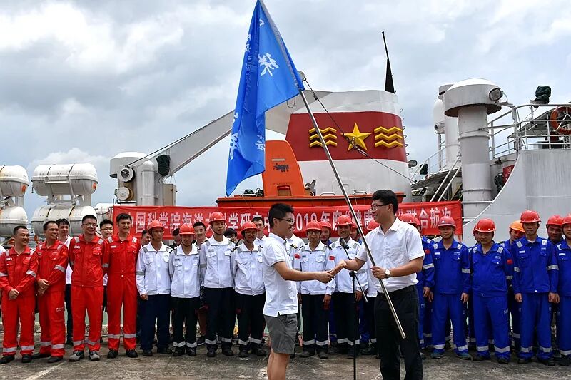 南海海洋所所长助理孙龙涛向珠江口航段科考队员授旗 . w8 {, r2 y$ A