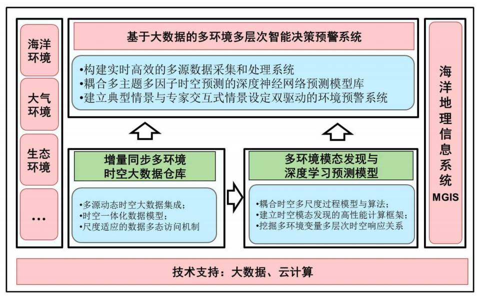 : R* n- P! G' q 传统的MGIS应用已经十分广泛,用于海洋功能区的管裡和规划、海岸带的管理和规划、海洋环境的管理和保护、海洋资源的开发管理与保护、海洋环境的监测、评价与预报, 海洋防务数据的管理、分析和辅助决策等方面。技术的革新有助于提高人们对问题的认知水平, 从不同的角度和层次看待问题,获得更好的解决问题的途径。技术最终是要服务于应用,大数据技术与海洋地理信息系统相结合的落脚点、未来的发展方向将是构建多环境要素的多层次的实时的决策预警系统。依据大数据的“相关而非因果”思维,在多样而全面的数据仓库中,应用多环境模态发现深度学习模型,快速而准确地找到规律,预测事物的进一步发展,为决策者提供依据。为建立该预警系统,首先,在MGIS平台上构建海洋环境、大气环境、生态环境、经济环境、社会环境等海洋时空大数据仓库,以大数据云计算为支撑,集成多源时空数据资源和集成,实现尺度适应的高性能多模态数据访问机制;其次,使用耦合时空多尺度过程模型与算法,建立时空模态发现的高性能计算框架,挖掘出多环境变量多层次时空响应关系;最后构建实时高效的多源数据采集和处理系统,耦合多主题多因子海洋环境问题时空预测的深度神经网络预测模型库,研究建立典型情景与专家交互式情景设定双驱动的环境预警链,实现面向海洋环境问题的多层次智能决策预警系统。基于大数据的多环境多层次智能决策预警系统的框架见图2。