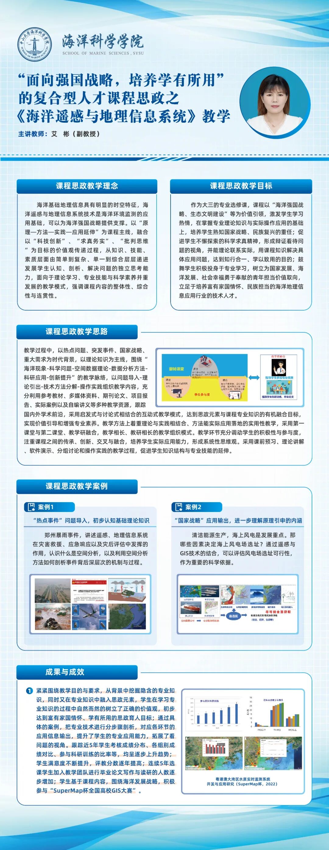 ) O! N j9 I F% K( D% X/ T: R 为深入贯彻落实习近平总书记关于教育的重要论述、全国教育大会精神、《高等学校课程思政建设指导纲要》文件精神,培养德才兼备的海洋事业接班人和未来的海洋科学家,中山大学海洋科学学院自2017年起,围绕课程思政育人建设目标,以“理念-操作-管理-成效”为核心,实施课程思政教学改革“三步走”战略和“六联式”工作机制,以课程思政提升课程内涵,以课程内涵丰富课程教学,营造“对标卓越老师,全员踊跃参与”的浓厚课程育人文化氛围,全面推进课程思政建设,发挥每位教师、每门课程的育人作用。截至2022年7月,学院分四批次开展了82门课程的课程思政教学改革。即日起,中山大学海洋科学学院将陆续推出“课程思政”教学改革成果,敬请关注! 课程简介. ?5 X5 }/ P( [" e! D