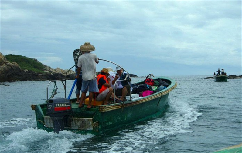 ) S, N- H' n3 H) Q: } 大洲岛,又称燕窝岛,位于海南省万宁市境内,是海南岛东南部浩瀚的海面上最大的岛屿,与万宁市乌场港隔海相望。坐船头,比划剪刀,吉行天下大旗飘飘。后方,是乌场港。前方,就是大洲岛。随手一分为二远观大洲,左侧是南大洲,有两峰,最高峰为289米,是大洲岛海洋生态国家级自然保护区的核心区域。右侧为北大洲,有一峰。由这两岛三峰组成的陆地面积大约4.36平方公里。