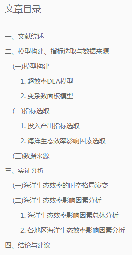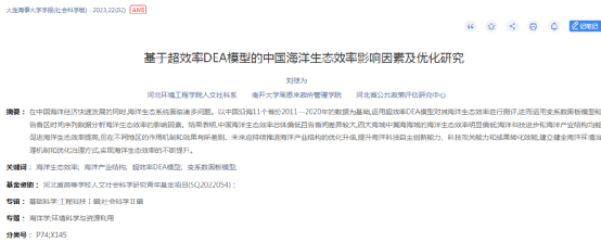 近日,我智库核心专家、管理团队成员、河北环境工程学院教师和南开大学周恩来政府管理学院访问学者刘继为博士在AMI扩展期刊《大连海事大学学报(社会科学版) 》署名我智库发表《基于超效率DEA模型的中国海洋生态效率影响因素及优化研究》一文,该文认为:在中国海洋经济快速发展的同时,海洋生态系统面临诸多问题。以中国沿海11个省份2011—2020年的数据为基础,运用超效率DEA模型对其海洋生态效率进行测评,进而运用变系数面板模型和各省区时间序列数据分析海洋生态效率的影响因素。结果表明,中国海洋生态效率总体偏低且各省间差异较大,四大海域中黄海海域的海洋生态效率明显偏低;海洋科技进步和海洋产业结构均能促进海洋生态效率提高,但在不同地区的作用机制和效果有所差别。未来应持续推进海洋产业结构的优化升级,提升海洋科技自主创新能力、科技攻关能力和成果转化效能,建立健全海洋环境治理机制和优化治理方式,实现海洋生态效率的不断提升。   通讯:宋笑楠,张君颖审核:彭建交发布:姜学永,贺春亮