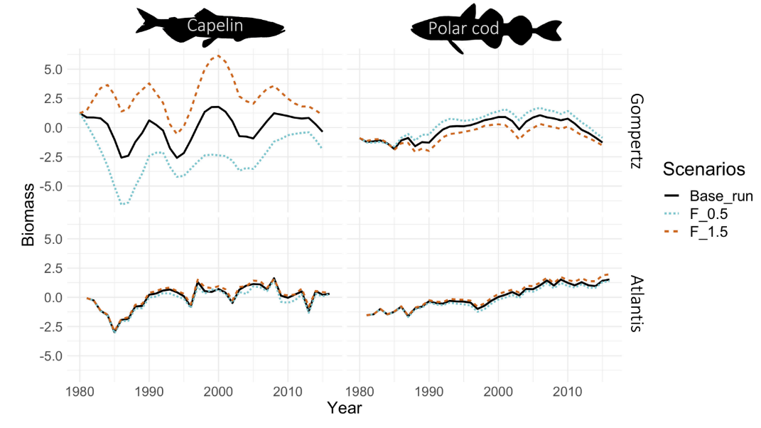 ● 在响应量级上,与Gompertz模型相比,毛鳞鱼和极地鳕在Atlantis模型中受到东北北极鳕扰动的影响较小。两个模型的预测结果均显示,东北北极鳕生物量的增加会导致毛鳞鱼生物量减少。 # W( V! F; L- k9 B7 t
