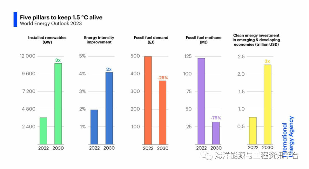 新闻快讯 国际能源署(International Energy Agency)的最新报告指出,到 2030 年,能源世界的格局将发生巨大变化。虽然全球能源困境有所缓解,但由于乌克兰危机久拖不决,中东冲突旷日持久的风险隐约可见,尽管石油和天然气价格已从2022年的峰值回落,但市场依然紧张动荡。在这种背景下,尽管新的清洁能源经济的出现被视为隧道尽头的一线曙光,但国际能源署仍坚持认为,要保持 1.5°C的目标,需要更强有力的政策和国际合作。全球能源危机的遗留问题是否会导致化石燃料时代的终结?国际能源署(IEA)最新一期《世界能源展望》(WEO)描绘了 2030 年清洁技术将发挥更大作用的能源系统,包括全球上路行驶的电动汽车数量几乎是现在的十倍;太阳能光伏发电的发电量超过美国目前整个电力系统的发电量;可再生能源在全球电力结构中的比例从现在的30%左右提高到接近50%;热泵和其他电热系统在全球范围内的销量量超过了化石燃料锅炉;新的海上风电项目投资是新建燃煤和燃气发电厂投资的三倍。根据世界各国政府目前的政策设定,这些增长表明,如果各国按时全面履行其国家能源和气候承诺,2030年能源领域上将出现重大变化,这为进一步加快清洁能源的发展打开了大门。然而,国际能源署警告称,要实现将全球升温控制在 1.5°C的目标,仍需采取 "更强有力的措施"。国际能源署执行主任法提赫-比罗尔博士评论说:“向清洁能源的过渡正在全球范围内进行,而且势不可挡。这不是是否的问题,而是多快的问题——对我们所有人来说,越快越好。政府、公司和投资者需要支持而不是阻碍清洁能源转型。”"这将带来巨大的利益,包括新的工业机会和工作岗位、更大的能源安全、更清洁的空气、能源的普及、以及为每个人带来更安全的气候。考虑到当今传统能源市场的持续紧张和波动,石油和天然气代表着世界能源和气候未来的安全或可靠选择的说法,看起来比以往任何时候都更加薄弱"。随着全球对煤炭、石油和天然气的需求在这十年达到峰值,国际能源机构的报告强调,清洁能源技术的发展势头和全球经济结构的转变,对化石燃料产生了“重大影响”。因此,几十年来化石燃料在全球能源供应中所占的比例一直停留在80% 左右,到 2030 年,这一比例将下降到73%,而全球与能源相关的二氧化碳(CO2)排放量将在 2025 年达到峰值。此外,报告还指出,目前化石燃料的需求预计仍将过高,无法实现《巴黎协定》中将全球平均气温上升控制在1.5°C以内的目标。国际能源署指出,虽然将排放曲线弯曲到与这一目标一致的轨道上仍有可能,但要实现这一目标也“非常困难”。然而,不作为的代价可能是“巨大的”,因为根据该报告的数据,本世纪全球排放量仍将居高不下,足以使全球平均气温上升约2.4°C。鉴于此,《2023年世界经济展望》提出了到 2030 年让世界步入正轨的全球战略,其中包括五大支柱,这也为COP28气候变化会议的成功召开奠定了基础。这些支柱包括:将全球可再生能源发电能力增加两倍;将能源效率提高一倍;将化石燃料运营产生的甲烷排放量减少75%;建立创新的大规模融资机制,将新兴经济体和发展中经济体的清洁能源投资增加两倍;采取措施确保有序减少化石燃料的使用,包括停止批准新的无减产燃煤发电厂。6 a8 Z8 `: ?! _( z3 G" G